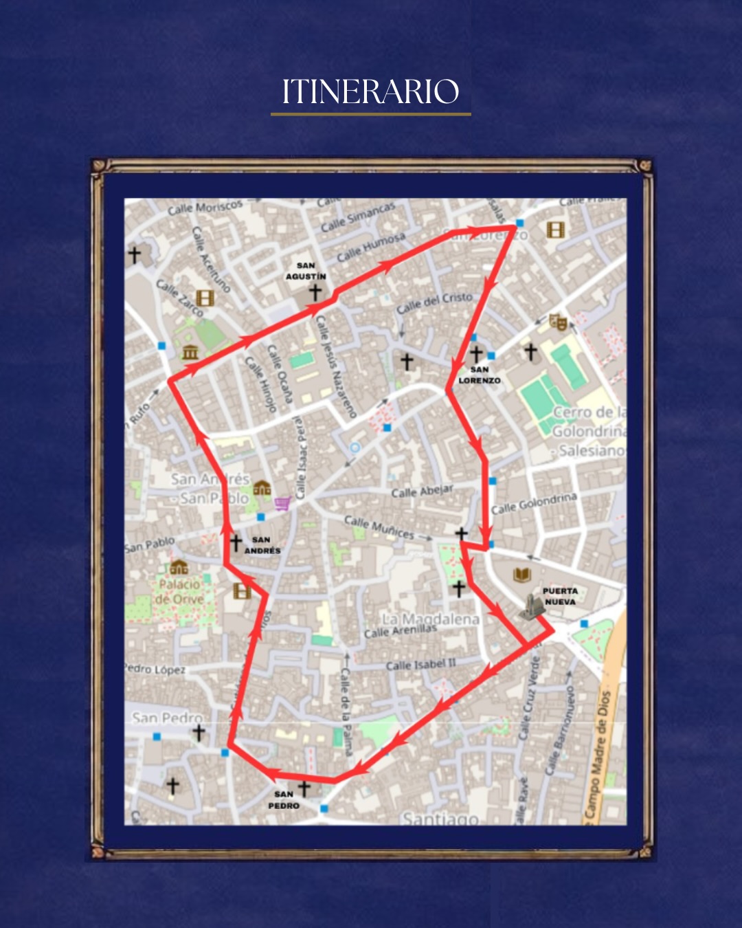 SALIDA (21:00H), Ronda de Andújar, Puerta Nueva, Alfonso XII (21:10h), Plaza de San Pedro, Basílica Menor de San Pedro (22:00h), Escultor Juan de Mesa, Plaza de la Almagra, Gutiérrez de los Ríos (22:30h), Fernán Pérez de Oliva, Plaza de San Andrés (23:00h), Hermanos López Diéguez, Enrique Redel (23:30h), Rejas de Don Gome, San Agustín (00:00h), Obispo López Criado, Montero (00:20h), Plaza de San Juan de Letrán, Jesús del Calvario, Plaza de San Lorenzo (01:00h), Arroyo de San Lorenzo, Ronda de Andújar, Plaza de la Magdalena (01:25h), Francisco de Borja Pavón, Alfonso XII, Puerta Nueva, Ronda de Andújar y ENTRADA (02:00H)